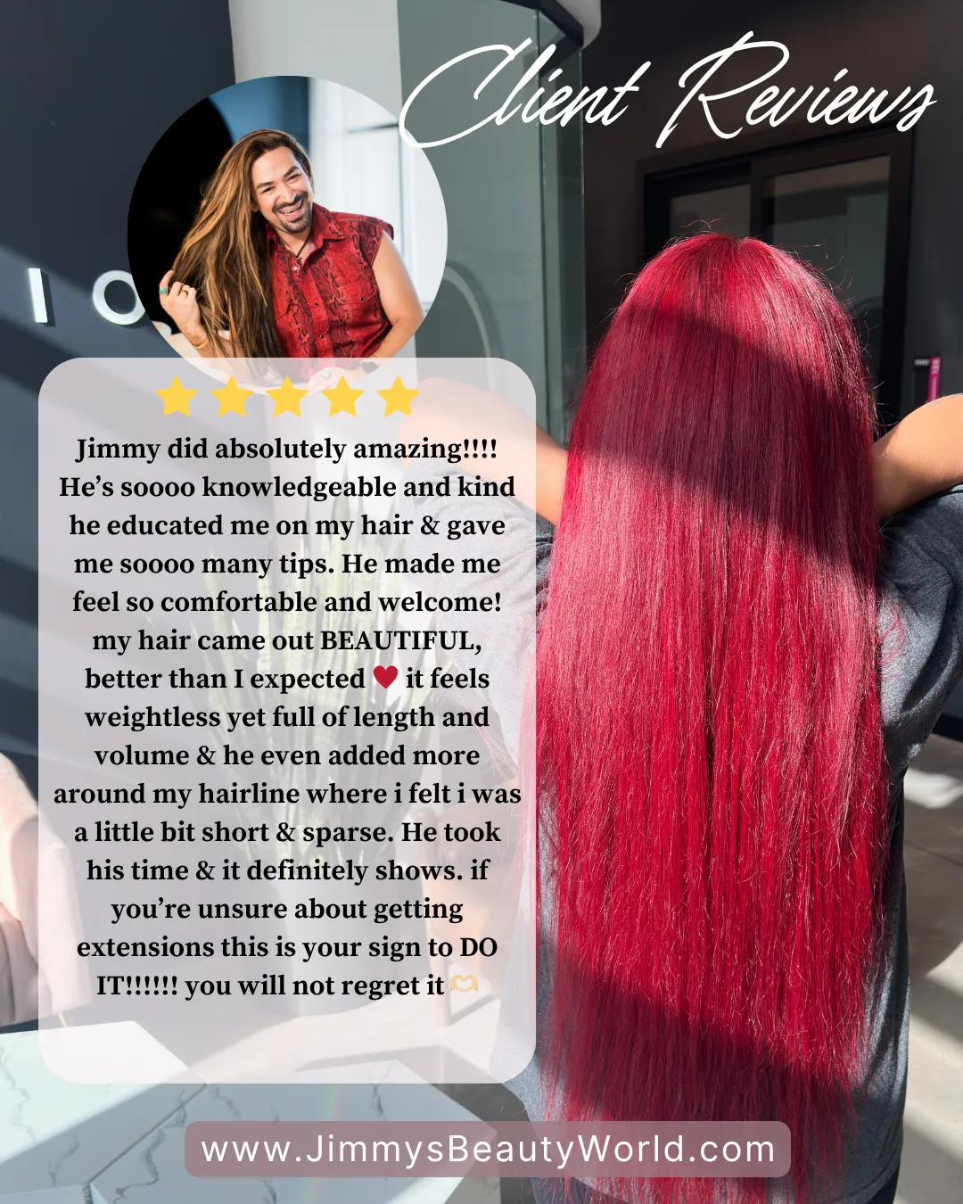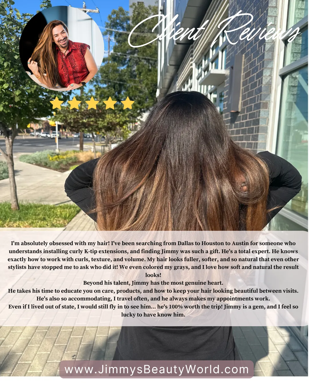 Welcome — I’m Jimmy Sanchez, a K-Tip Extension Specialist based in Austin, Texas. I create custom transformations designed to look natural, feel luxurious, and simplify your routine — so your hair moves and shines like it’s your own.”
